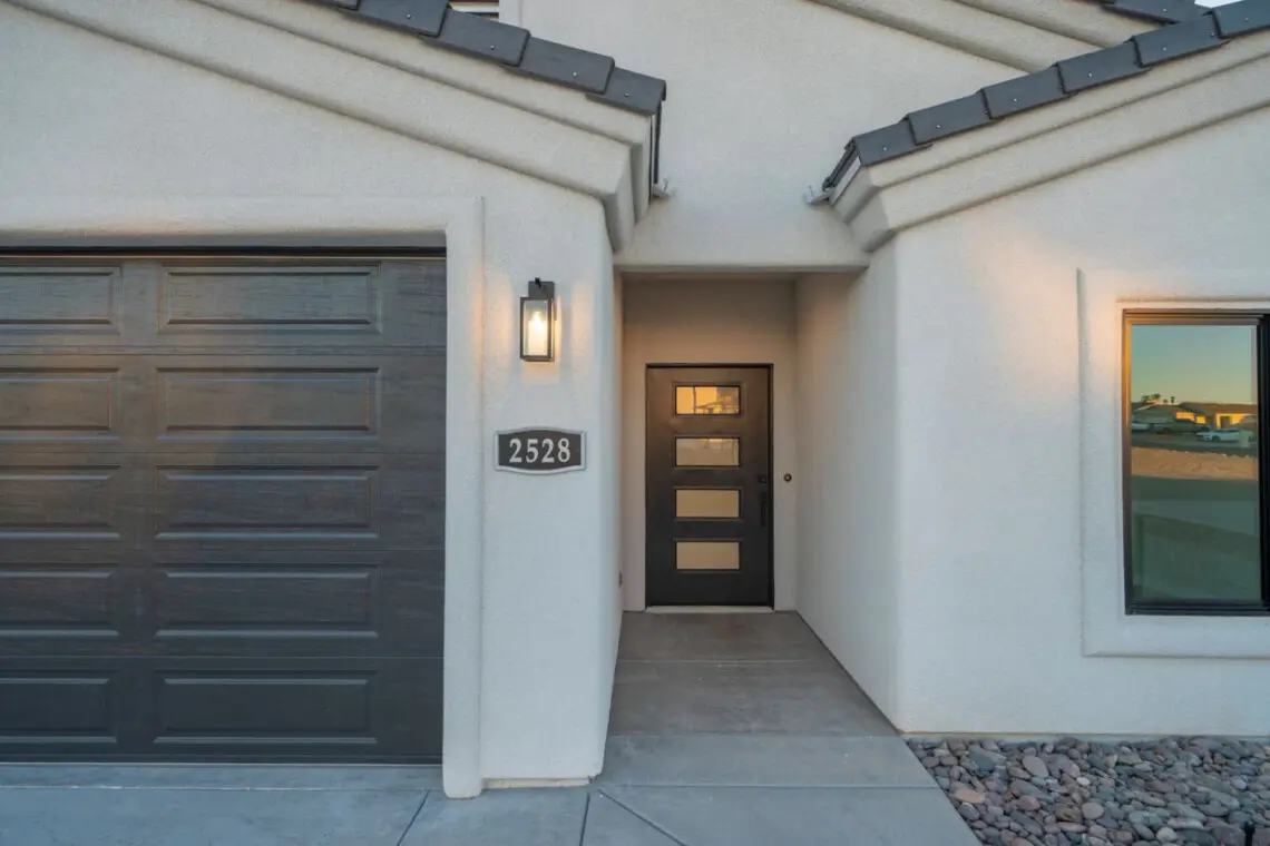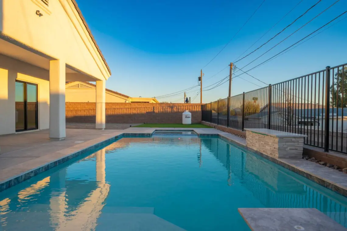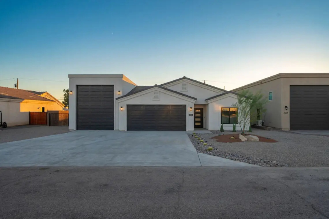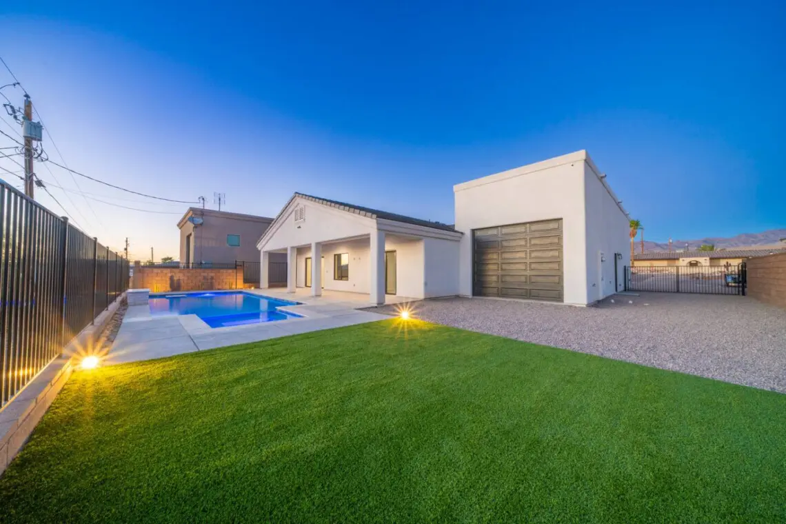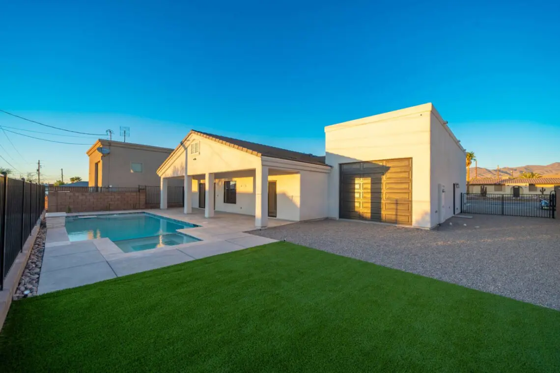 Modern new-build luxury retreat with private pool, spa and a sleep-friendly garage game room—just minutes from the lake.