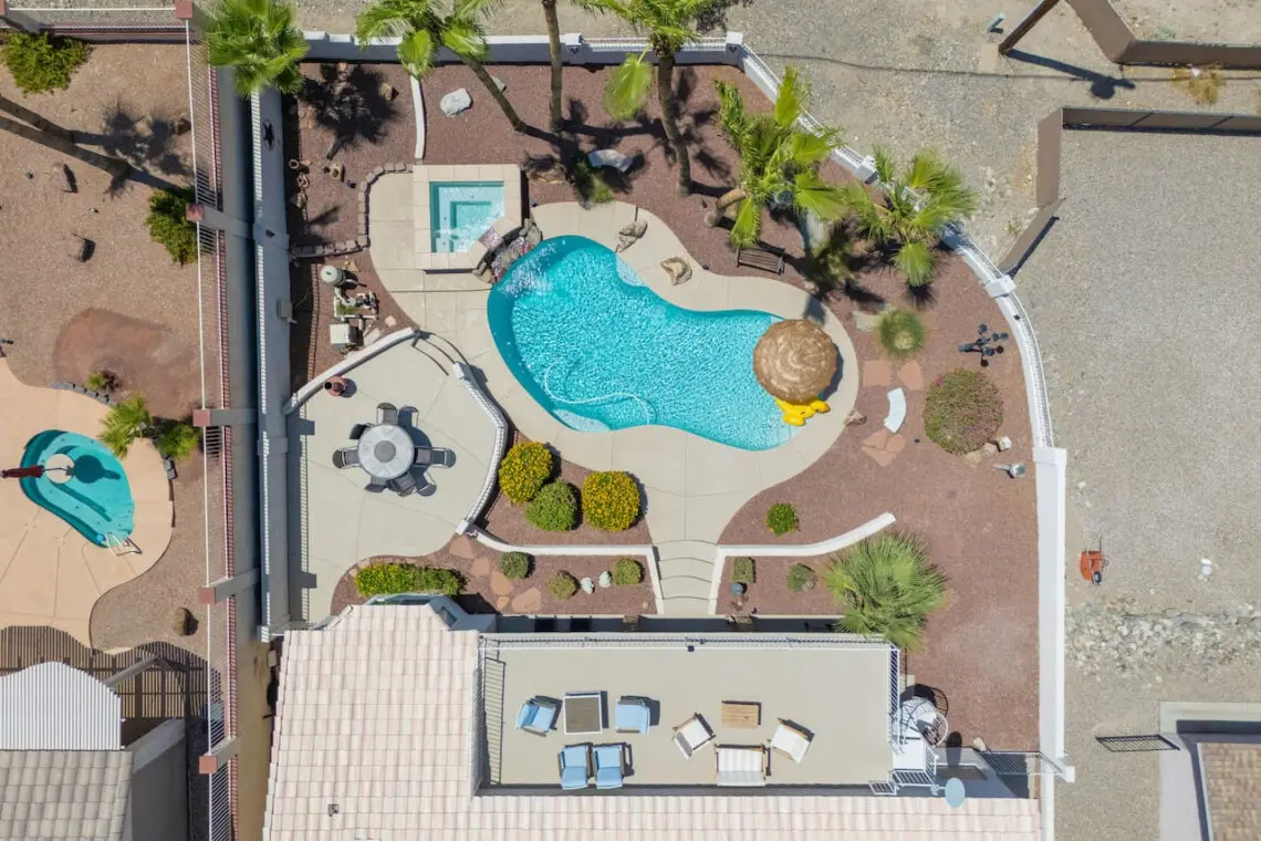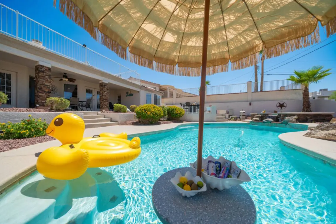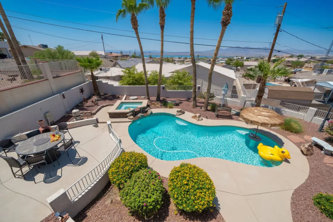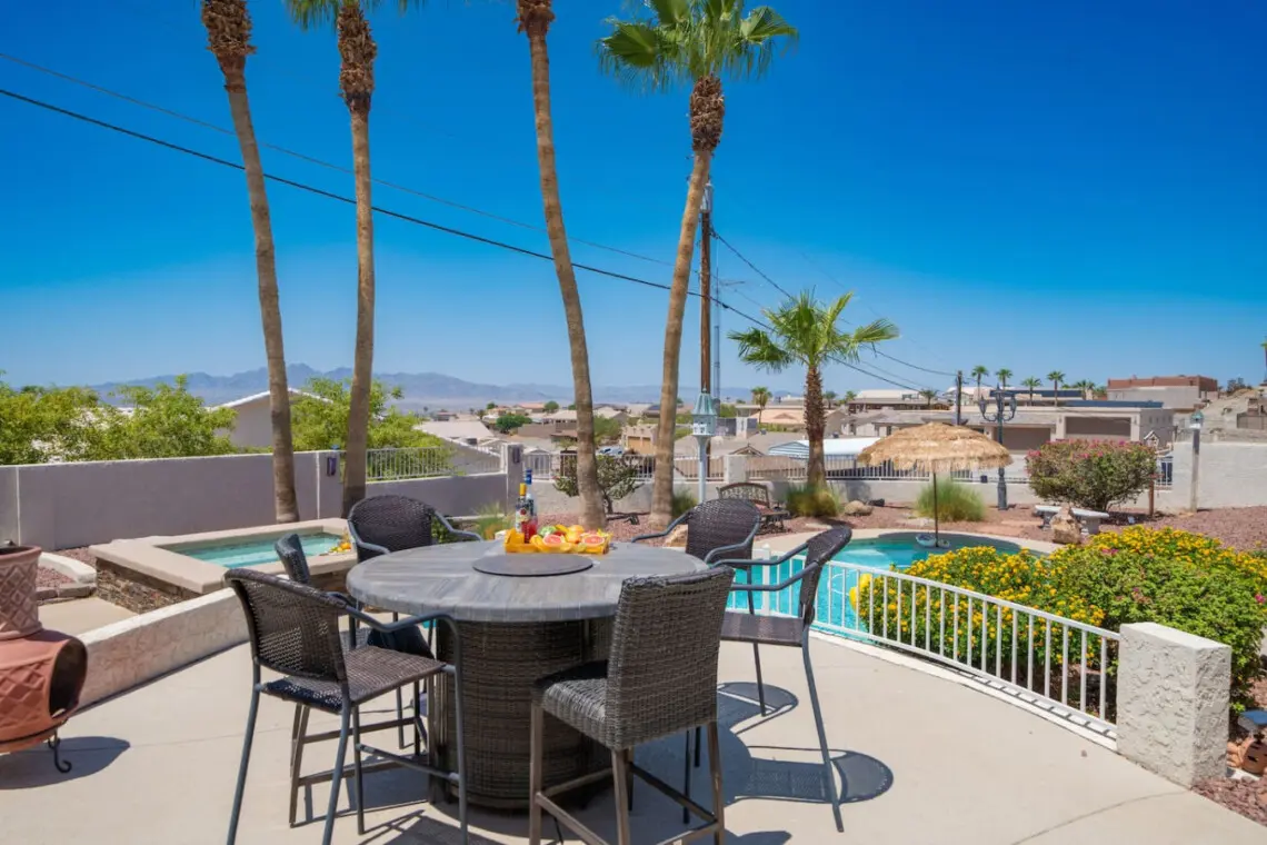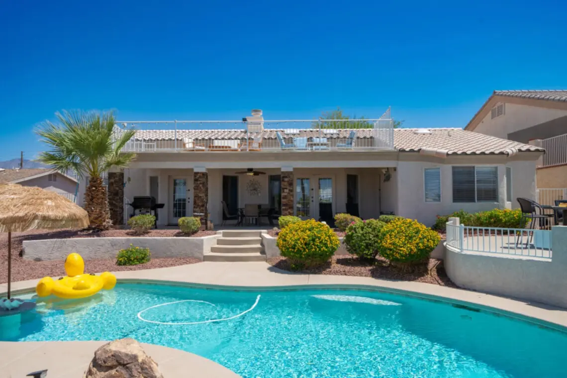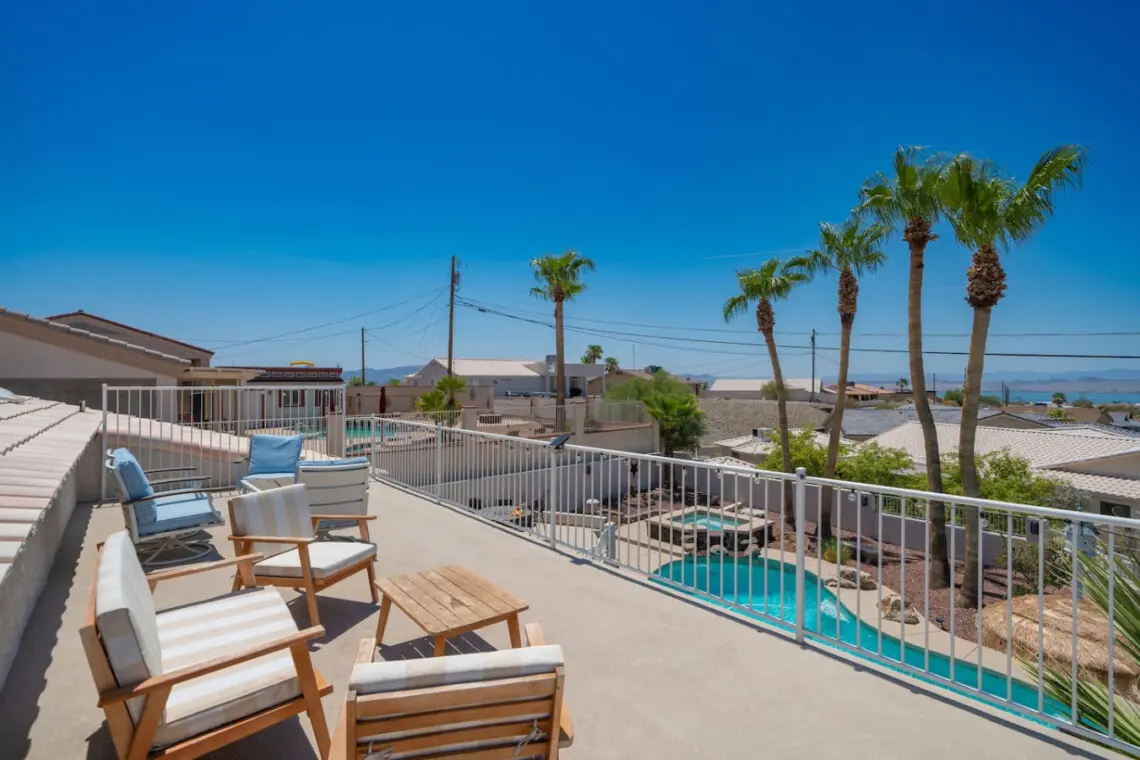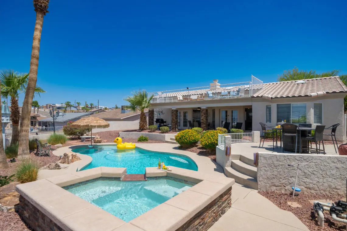 Swim or soak in the pool + spa, grill dinner on the BBQ, gather at the firepit, and head up to the rooftop deck for stargazing or sunrise coffee. A balcony/patio off the main level adds another perch for those Havasu views.