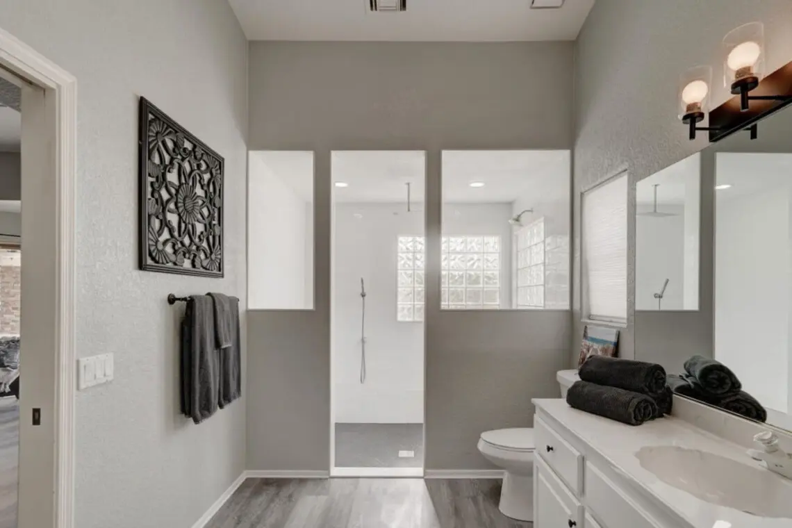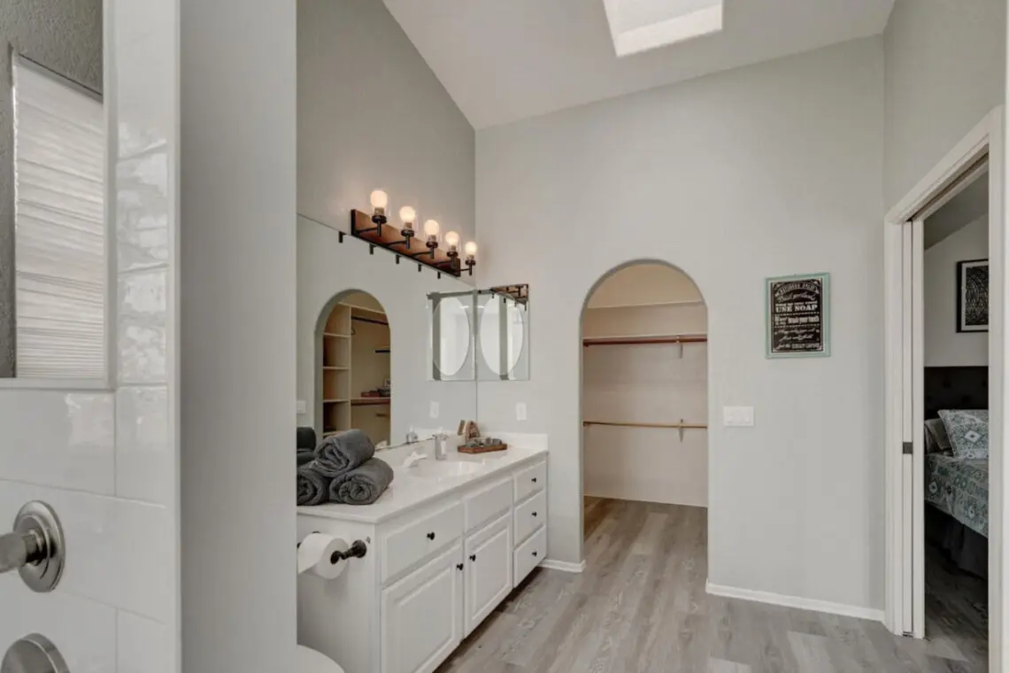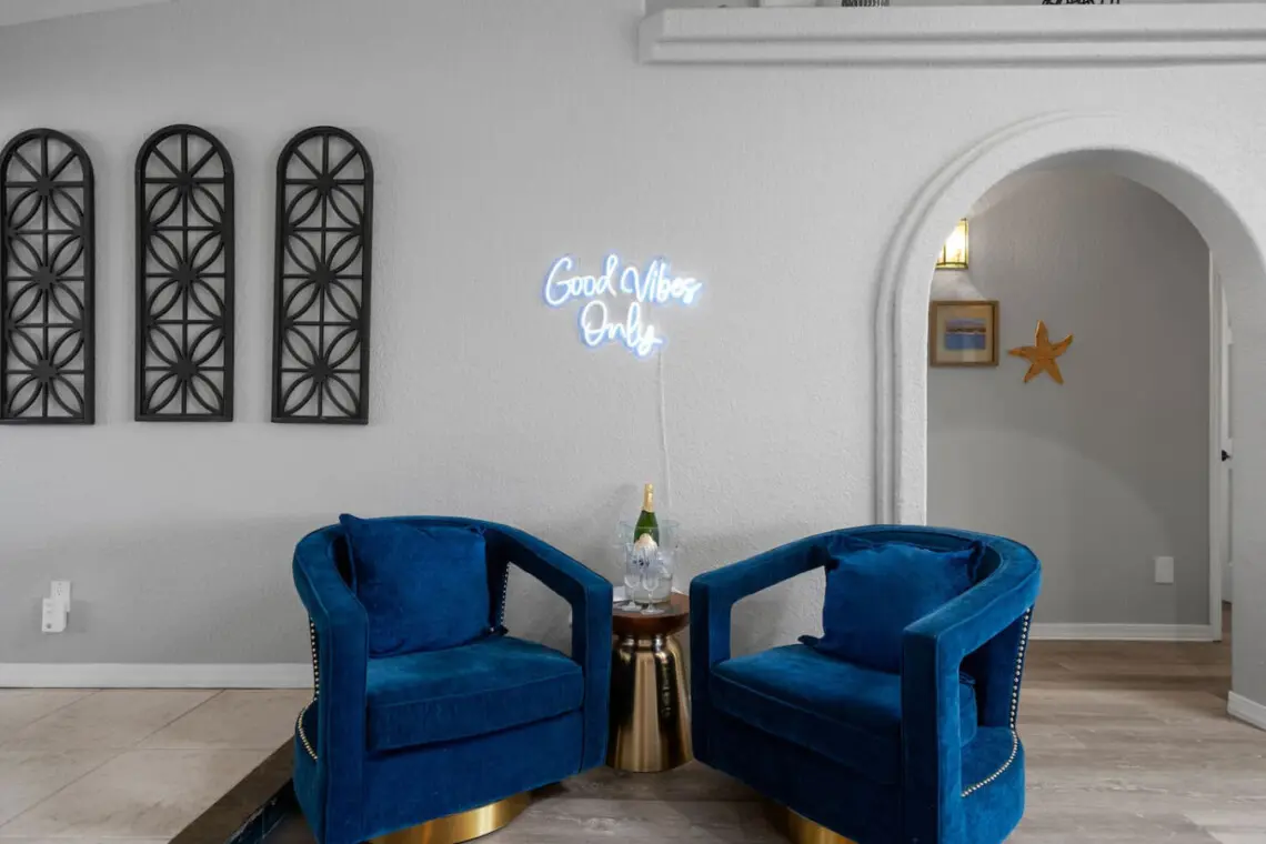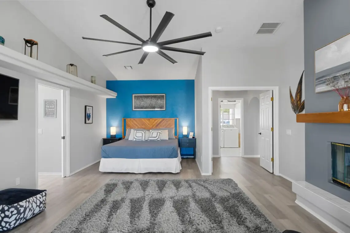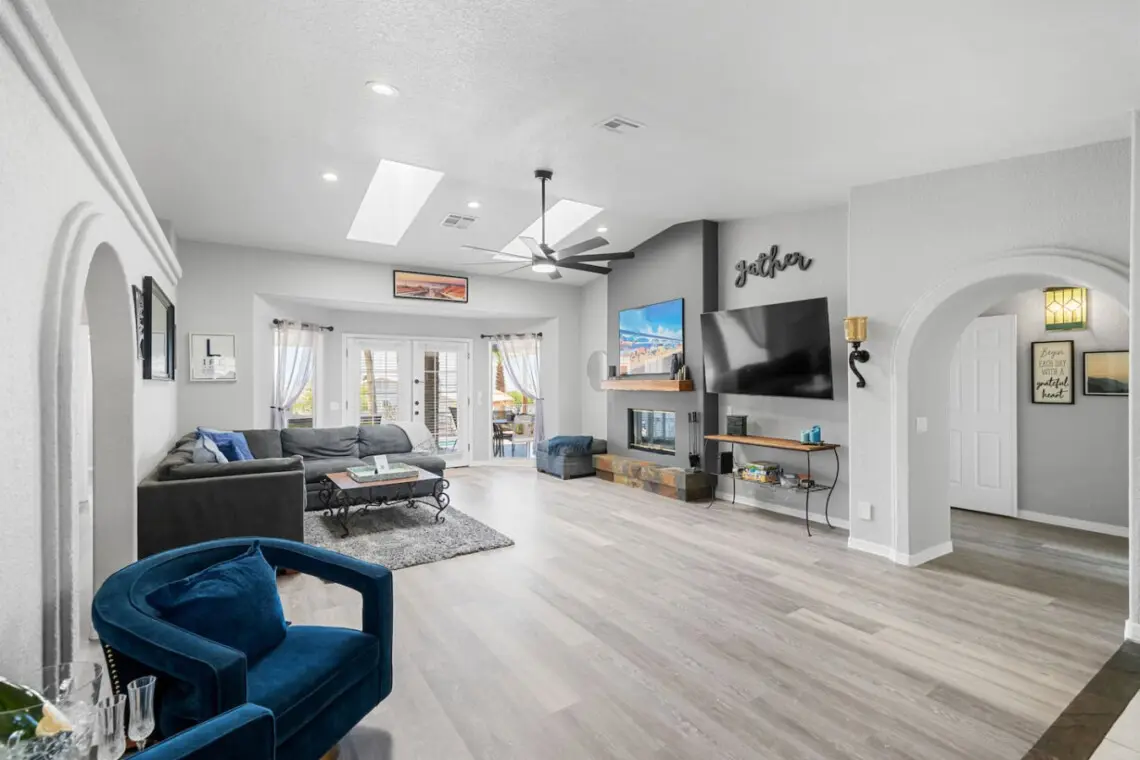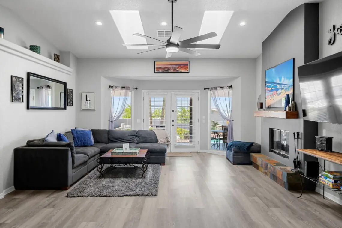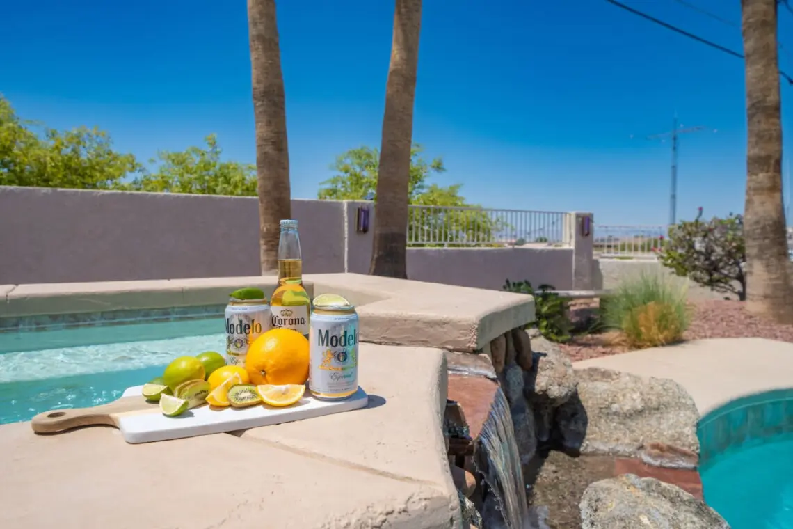 Swim or soak in the pool + spa, grill dinner on the BBQ, gather at the firepit, and head up to the rooftop deck for stargazing or sunrise coffee. A balcony/patio off the main level adds another perch for those Havasu views.
