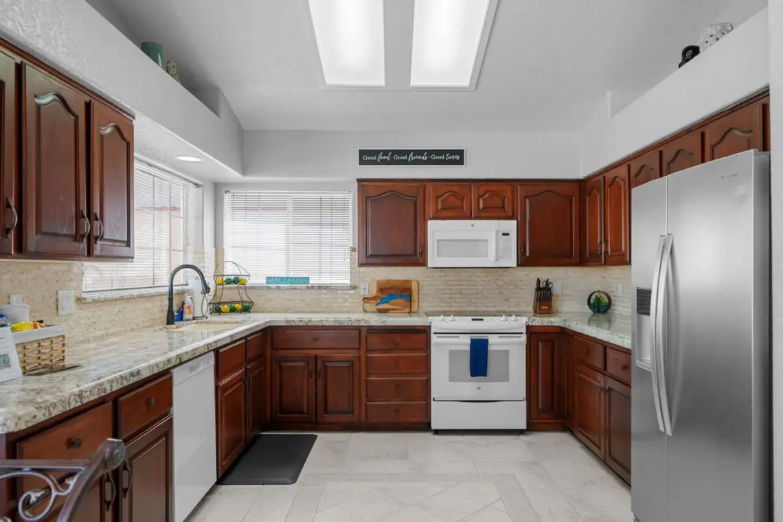 – Full kitchen: oven, cooktop, microwave, dishwasher, fridge, cookware