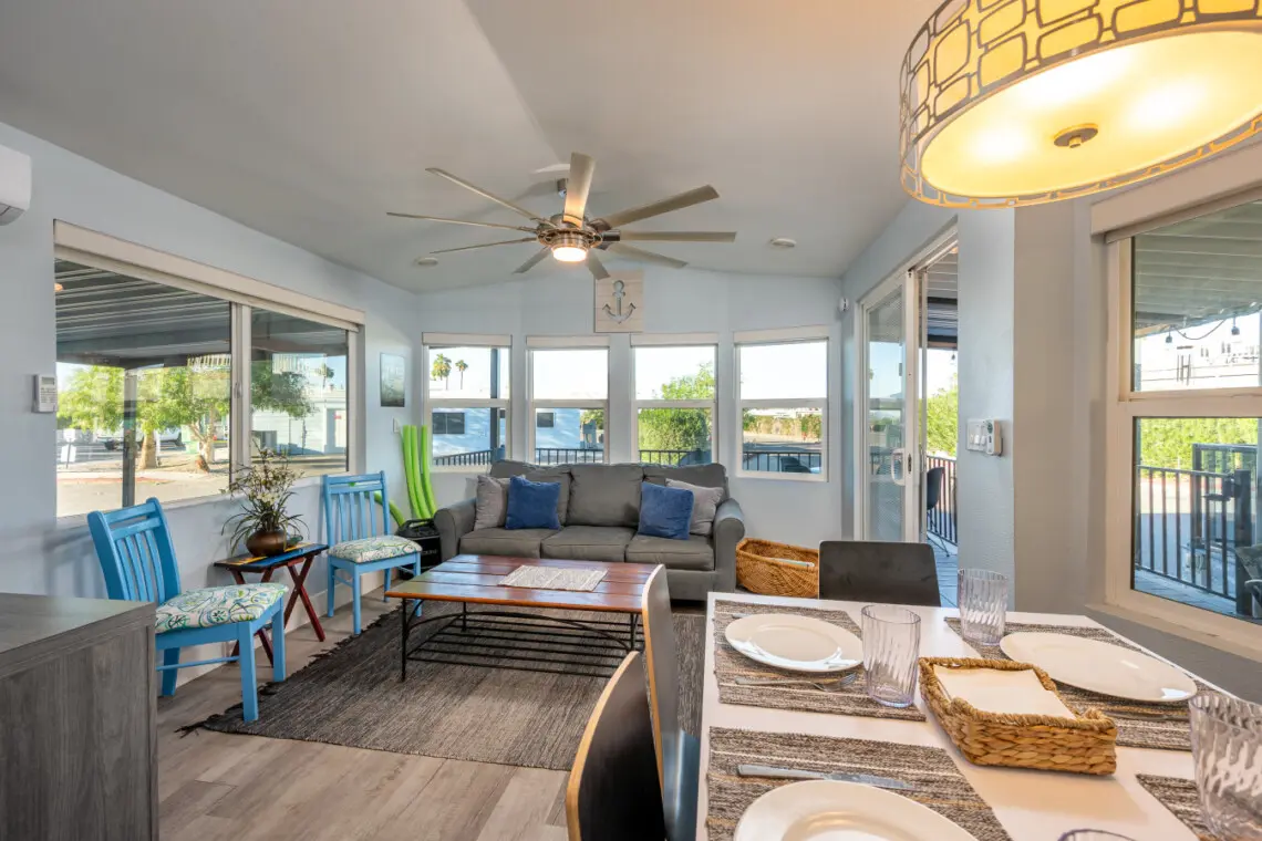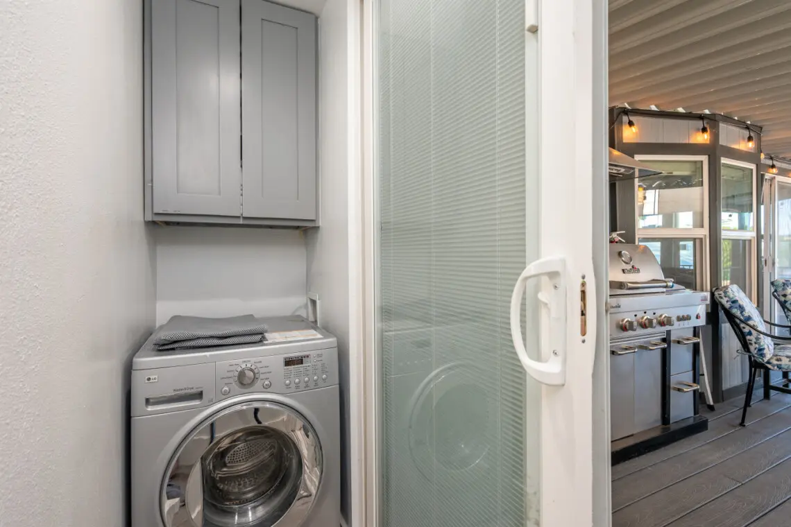 Enjoy the oversized patio, complete with outdoor dining space, built-in BBQ grill, and lounge area—perfect for entertaining or winding down after a day on the water. String lights add a cozy evening vibe, and the views off the back offer the perfect backdrop for your morning coffee or evening drinks.