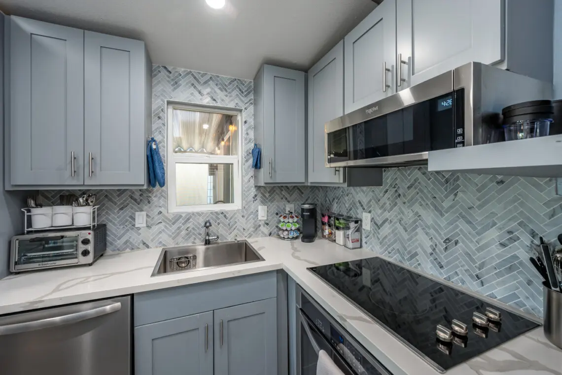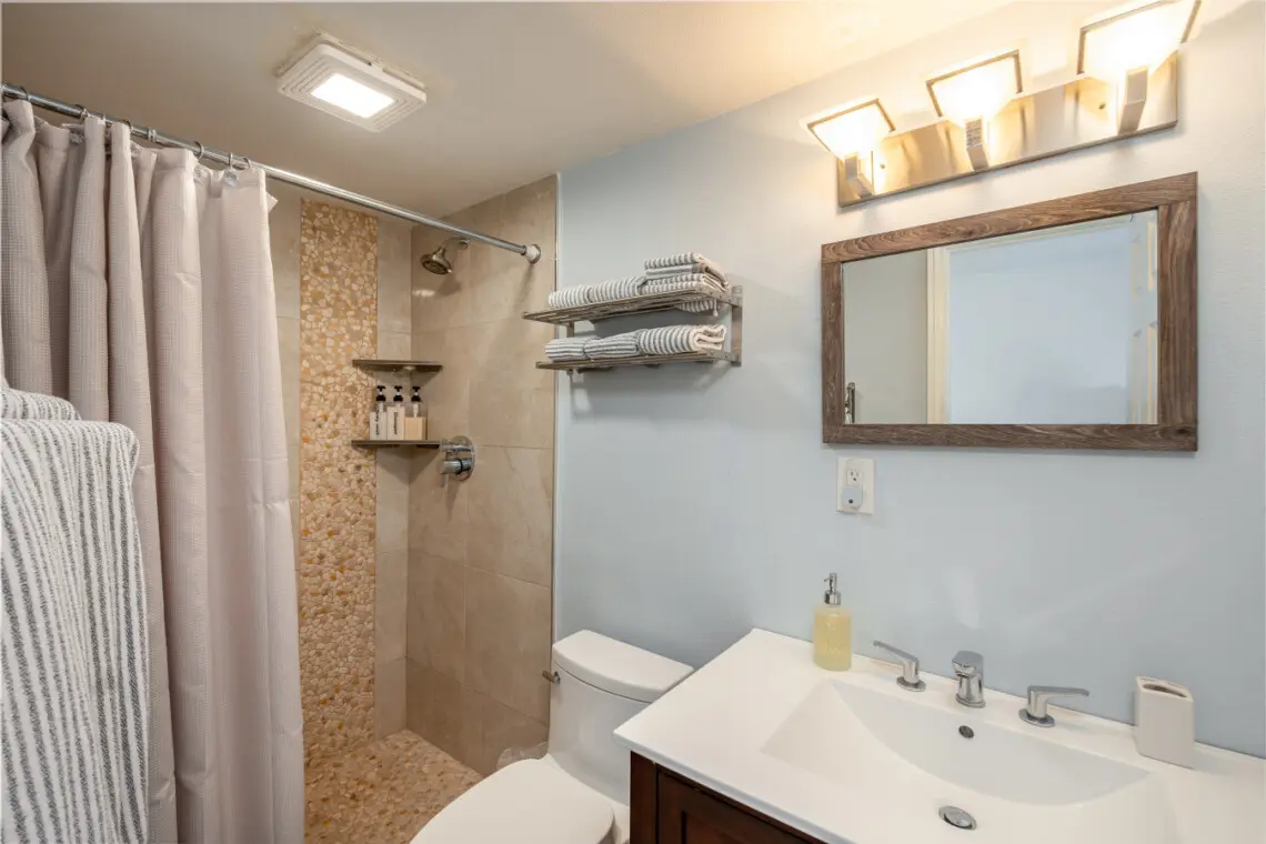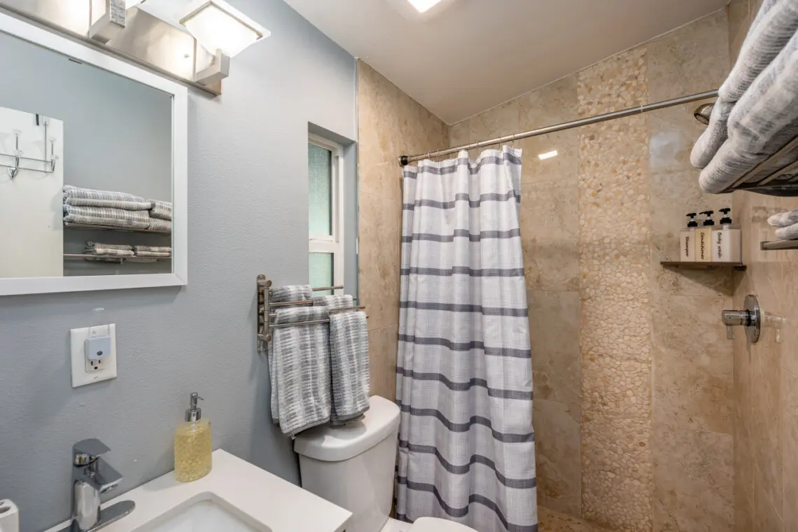 The open-concept kitchen comes fully stocked with cookware, utensils, coffee maker, toaster, microwave, and full-size appliances—including a side-by-side fridge. The living room is airy and comfortable with plenty of natural light. Each bedroom is thoughtfully designed, with comfy beds and plenty of storage. Both bathrooms are clean, modern, and fully equipped with everything you need.
